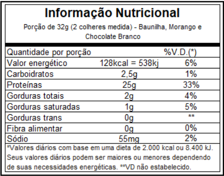 Sabor Chocolate: mistura proteica (proteína do soro do leite isolada, proteína do soro do leite concentrada, proteína do soro do leite hidrolisada), cacau em pó, aroma natural e artificial, estabilizante goma xantana, edulcorantes artificiais acessulfame de potássio e sucralose.